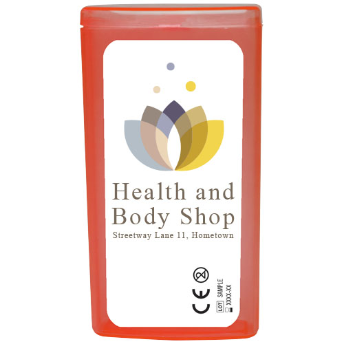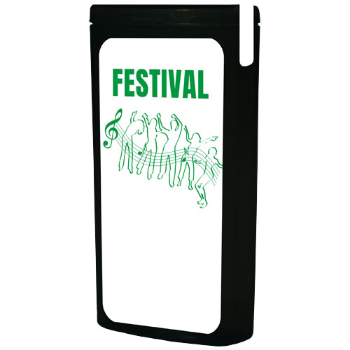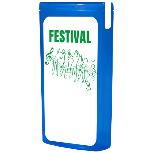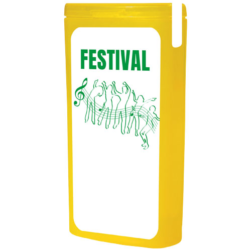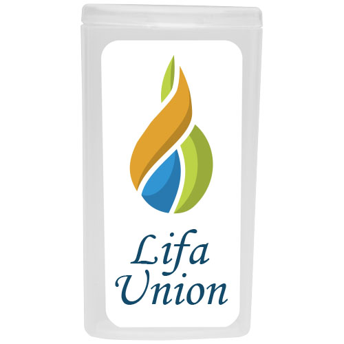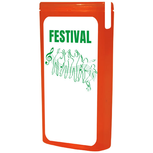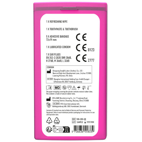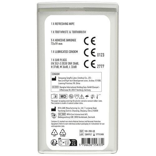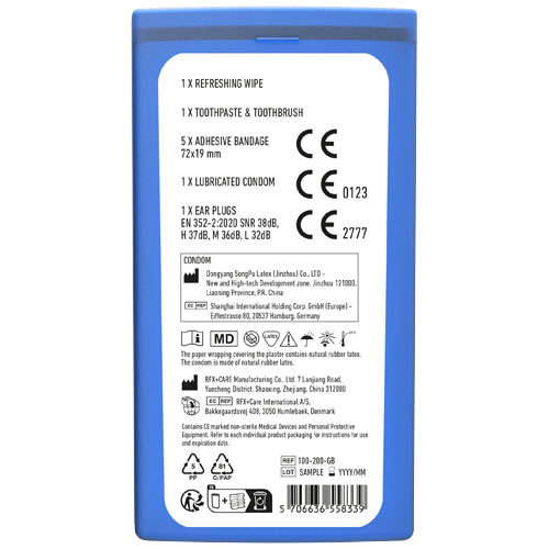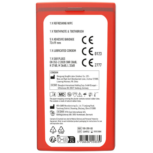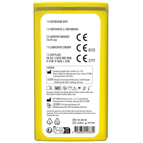 Il kit compatto per feste ed eventi. Contiene tutto ciò che serve per trascorrere una notte fuori casa. Le dimensioni di questo kit consentono di portarlo sempre con voi. Contenuto: 1 spazzolino, 1 dentifricio, 1 tappi per orecchie, 1 gel disinfettante, 5 cerotti resistenti all'acqua, 1 preservativo. Tutti i prodotti contenuti nei MyKit rispettano le norme Europee vigenti. I prezzi includono stampa all-over fronte e retro.