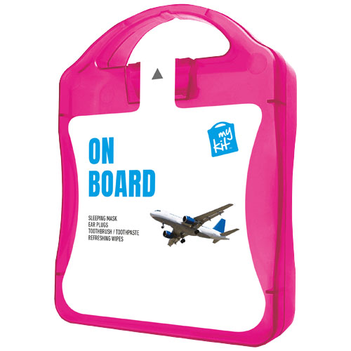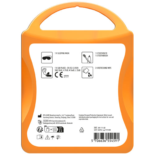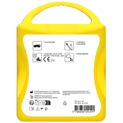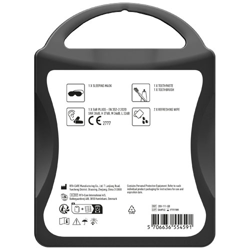 Il kit ideale per ogni viaggio. Con questo kit potrete rilassarvi e rinfrescarvi prima dell'arrivo a destinazione. Contenuto: 1 mascherina per gli occhi, 2 tappi per orecchie, 2 salviettine rinfrescanti. Tutti i prodotti contenuti nei MyKit rispettano le norme Europee vigenti. I prezzi includono stampa all-over fronte e retro.