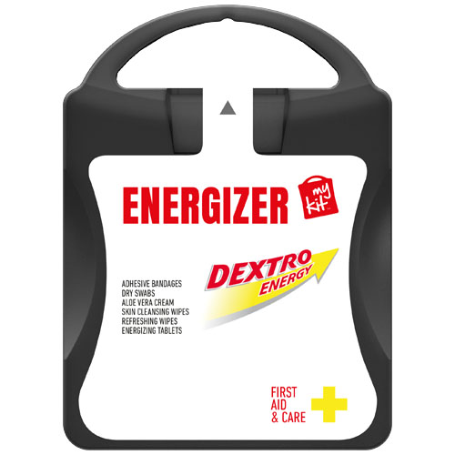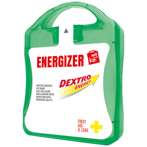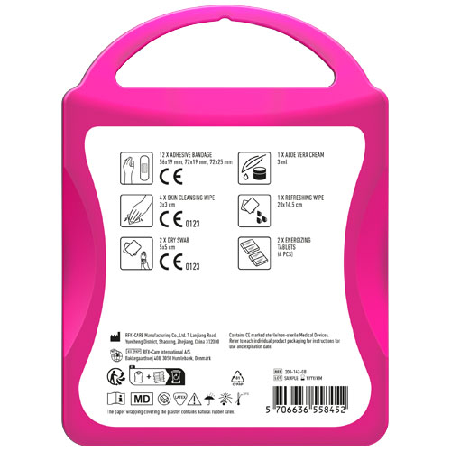 Il kit ideale per ogni attività all'aria aperta. Con questo kit potrete rilassarvi e rinfrescarvi dopo una lunga camminata, e la banda riflettente vi consentirà di essere visti in ogni occasione. Sarete anche pronti per ogni piccolo incidente. Contenuto: 12 cerotti resistenti all'acqua, 4 salviettine disinfettanti, 2 garze sterili, 1 banda catarifrangente, 1 cerotto per vesciche, 2 salviettine rinfrescanti. Tutti i prodotti contenuti nei MyKit rispettano le norme Europee vigenti. I prezzi includono stampa all-over fronte e retro.