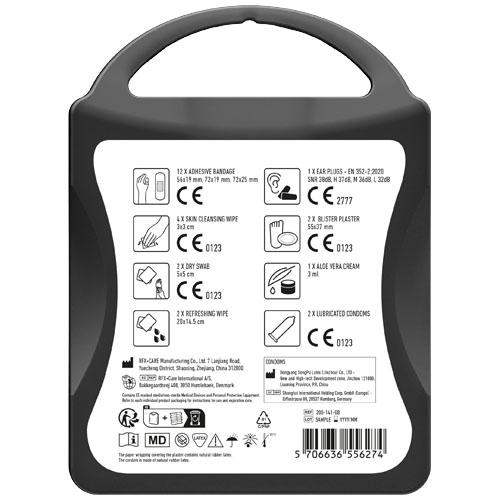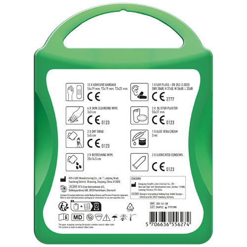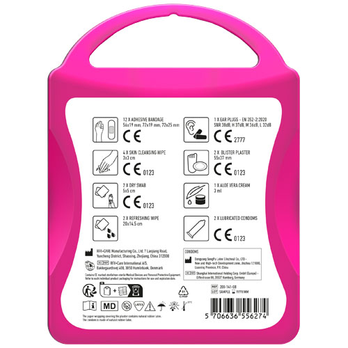Il kit di primo soccorso ideale per ogni evento. Grazie al contenuto, sarete preparati per ogni piccolo incidente. Contenuto: 12 cerotti resistenti all'acqua, 4 salviettine disinfettanti, 2 garze sterili, 2 salviettine rinfrescanti, 2 preservativi, 2 cerotti per vesciche, 1 crema all'aloe vera, 2 tappi per orecchie. Tutti i prodotti contenuti nei MyKit rispettano le norme Europee vigenti. I prezzi includono stampa all-over fronte e retro.