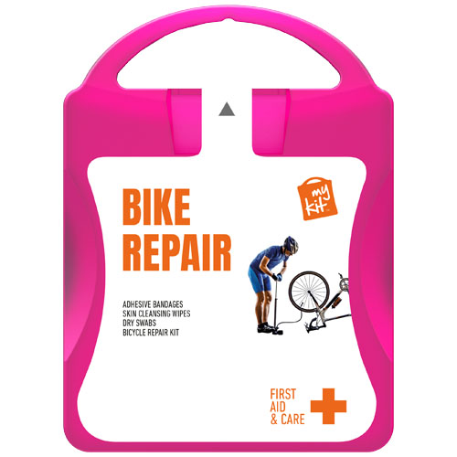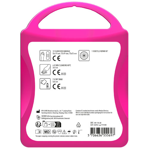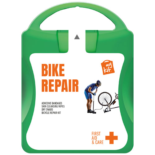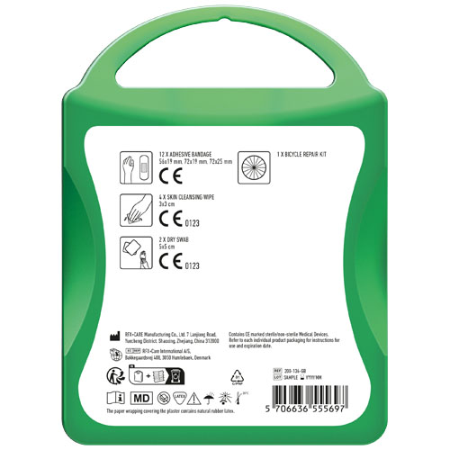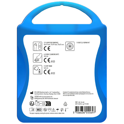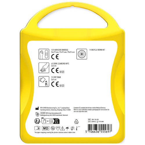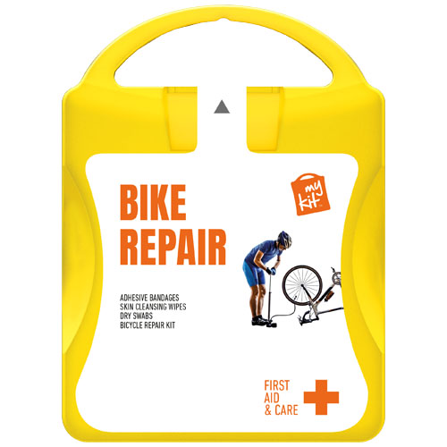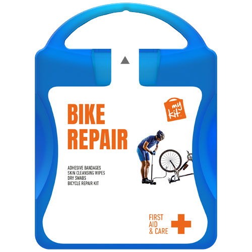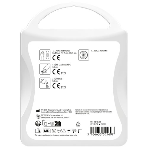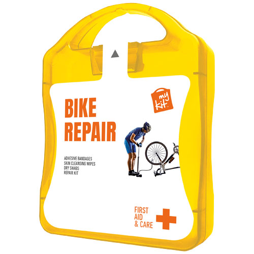 Il kit ideale ogni ciclista. Vi consente di essere preparati per ogni piccolo incidente, o in caso di foratura. Contenuto: 12 cerotti resistenti all'acqua, 4 salviettine disinfettanti, 2 garze sterili, 1 kit riparazione gomma. Tutti i prodotti contenuti nei MyKit rispettano le norme Europee vigenti. I prezzi includono stampa all-over fronte e retro.