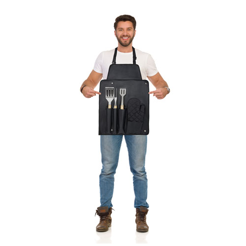 Set da barbecue composto da 5 pezzi: spatola (36,5 x 7 cm), forchettone (36,5 x 2 cm), pinza (36,5 x 5 cm), guanto (25 x 16 cm) e grembiule con custodia (42 x 60 cm). I manici sono realizzati in bambù ottenuto e prodotto in base a standard ecosostenibili.