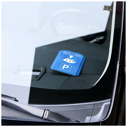 Disco orario con raschia ghiaccio, spazzola di gomma, moneta per carrello e misuratore di profondità del battistrada degli pneumatici. Il disco orario ha un'ampia area bianca sul retro per il logo. Il testo "Ora di arrivo" sulla copertura del disco è tradotto in olandese, inglese, francese, tedesco e italiano. Le normative possono variare a livello locale.